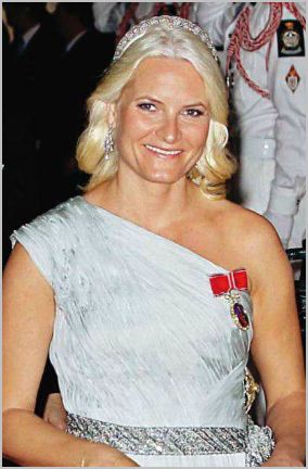 Marie de Dinamarca que es una mujer elegante y razonablemente discreta. Ya iba bien con sus pendientes de brillantes largos para su escote, y una diadema estrecha hubiera redondeado su elegante imagen, pero como había que disfrazarse con diadema pues hala!