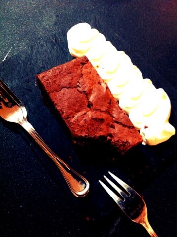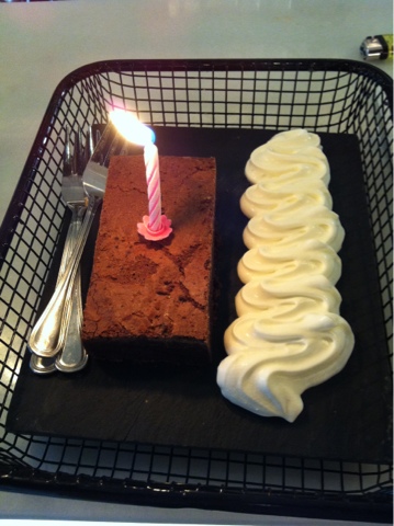 como había que celebrarlo por todo lo alto, tuvimos el detalle de pedirle un pequeño brownie ,de los brownies más buenos que he probado nunca y creerme, se de lo que estoy hablando que el dulce me gusta y no poco (los que me conozcáis ya lo sabeís) que estaba para morirse, del que sólo quedó el trocito de la vergüenza que Pat al final no se terminó.