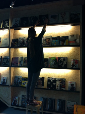 Según estaba sentada mirando esta estantería llena de revistas no pude evitar ver una banqueta y tener que cogerla para subirme y ver qué libros-revistas eran los que estaban arriba del todo que tanto me gustaban.