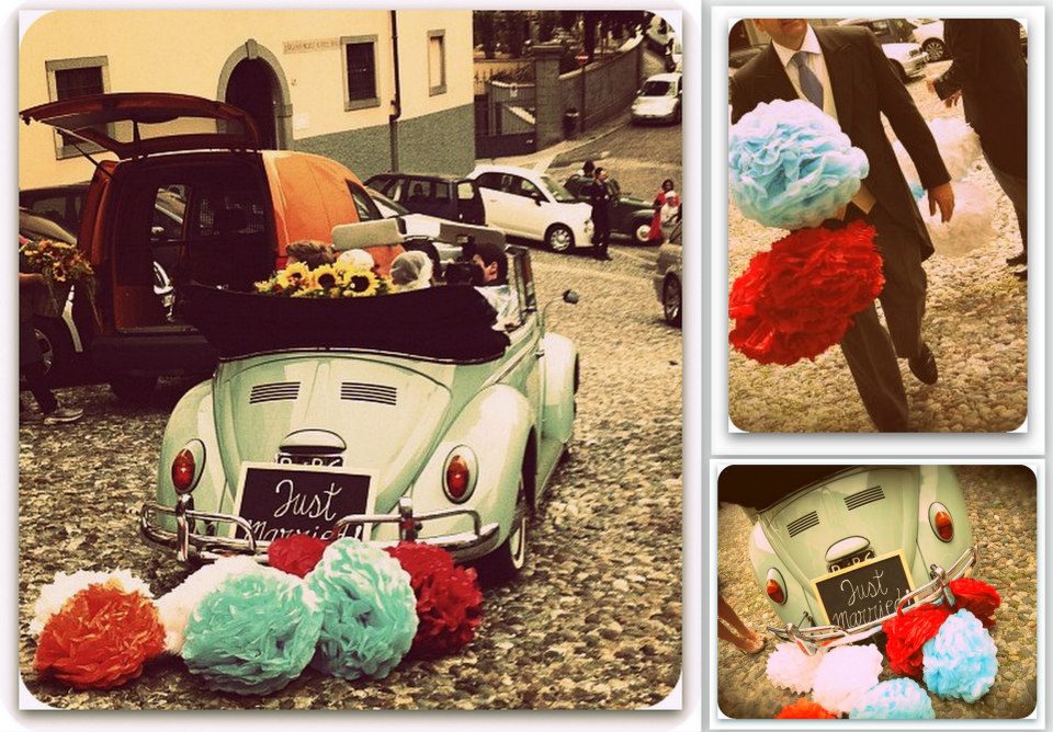 Pompones realizados por ella misma, para darle al coche un toque de color y elegancia.