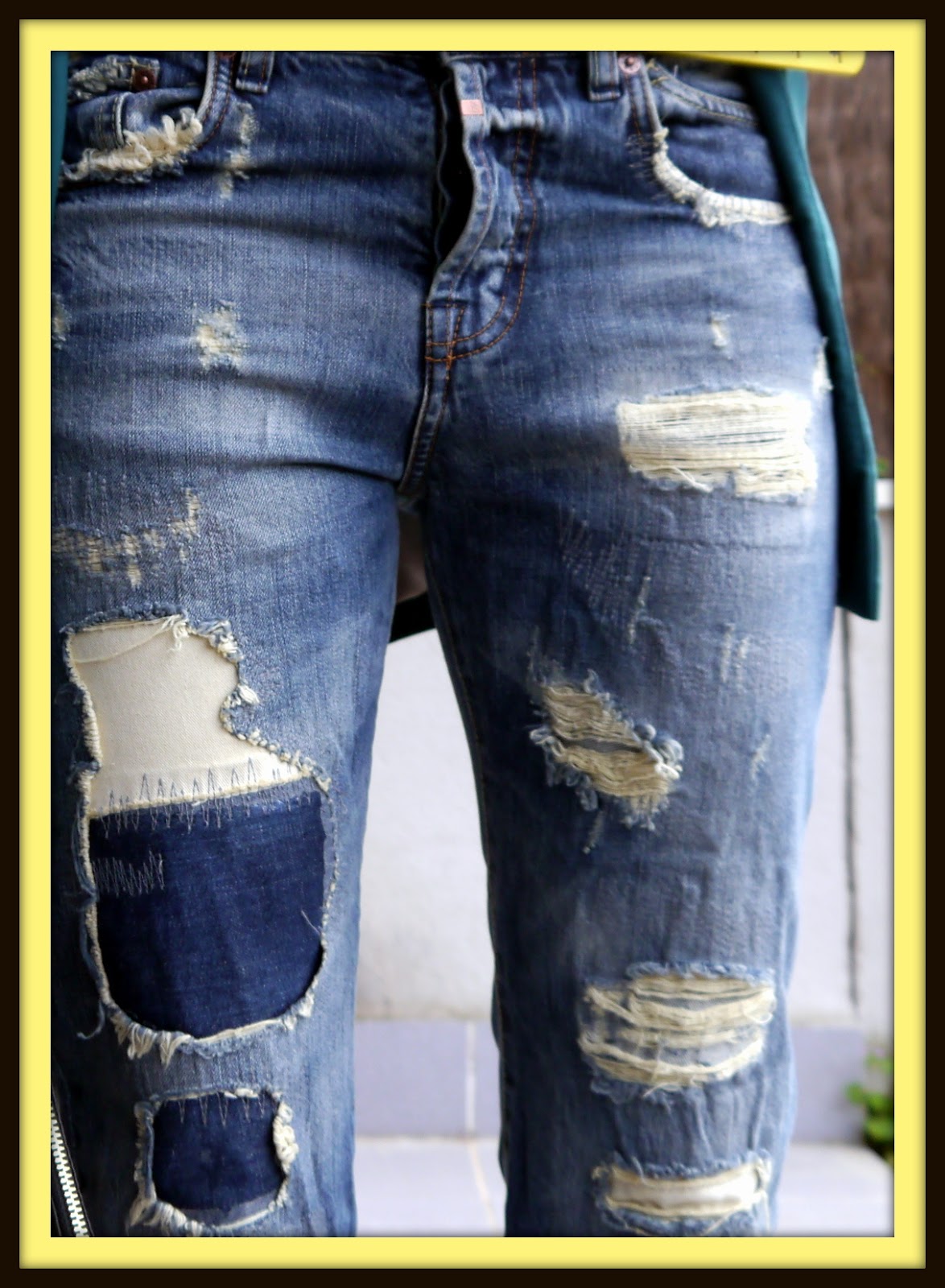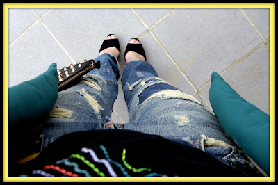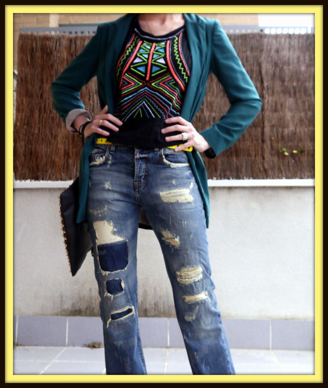 Estos vaqueros con mil patches son muy antiguos, rescatados de una montaña de ropa de rebajas en Zara en el centro comercial de Cartagena ( un día de compras veraniegas ), el cinturón con troquelado de palmeritas amarillo hace que tenga más protagonismo el pantalón ya que con los colorines de la camiseta lo tiene complicado.