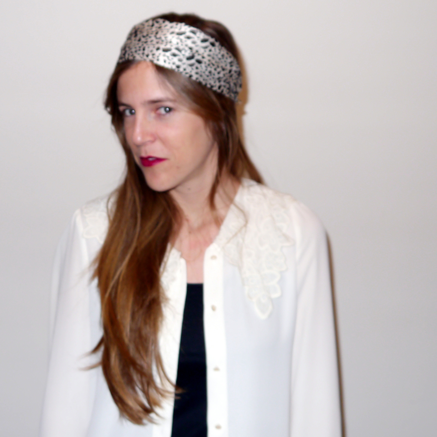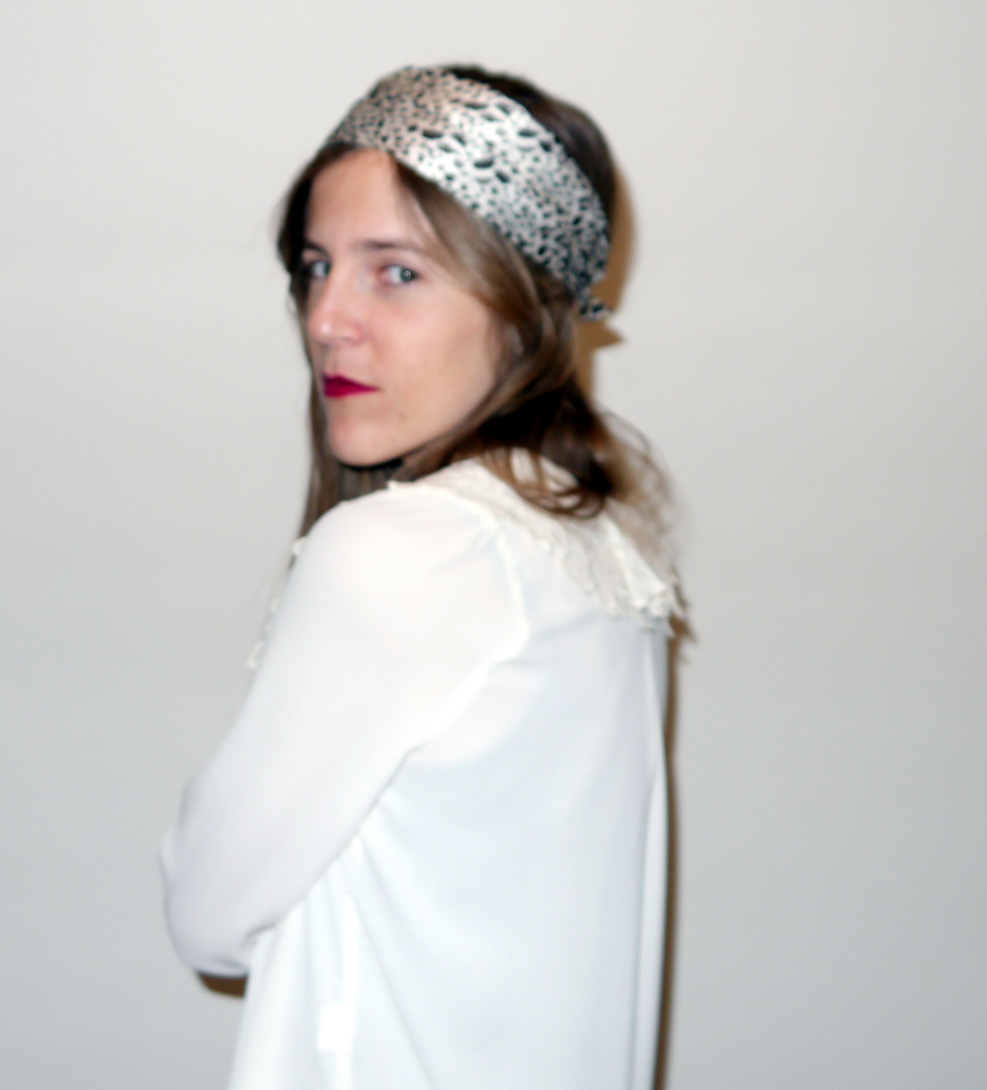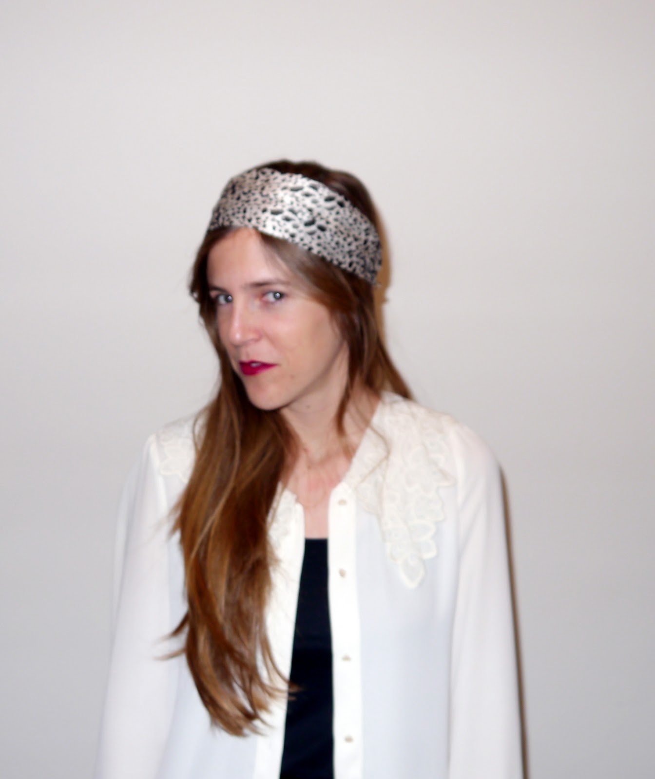 Esta vez decidí dejarme el pelo suelto y ponérmelo por encima ( al estilo icnta de pelo no me favorece) asi que así es como decidí llevar el pañuelo, ocn una camisa con cuello estilo antigüo de Sister Jane y camiseta básica negra debajo.