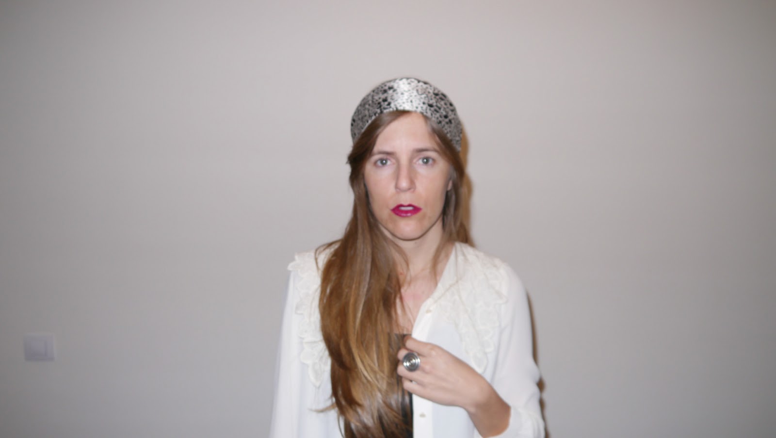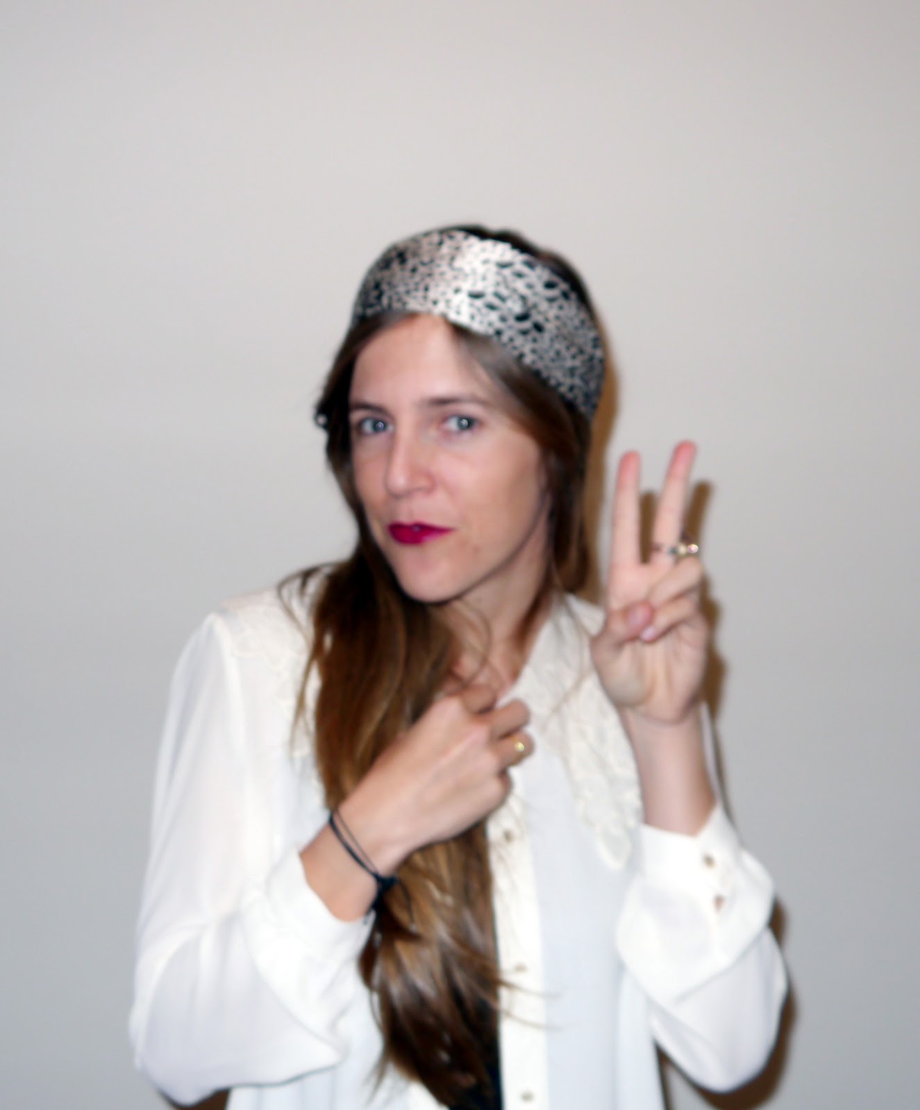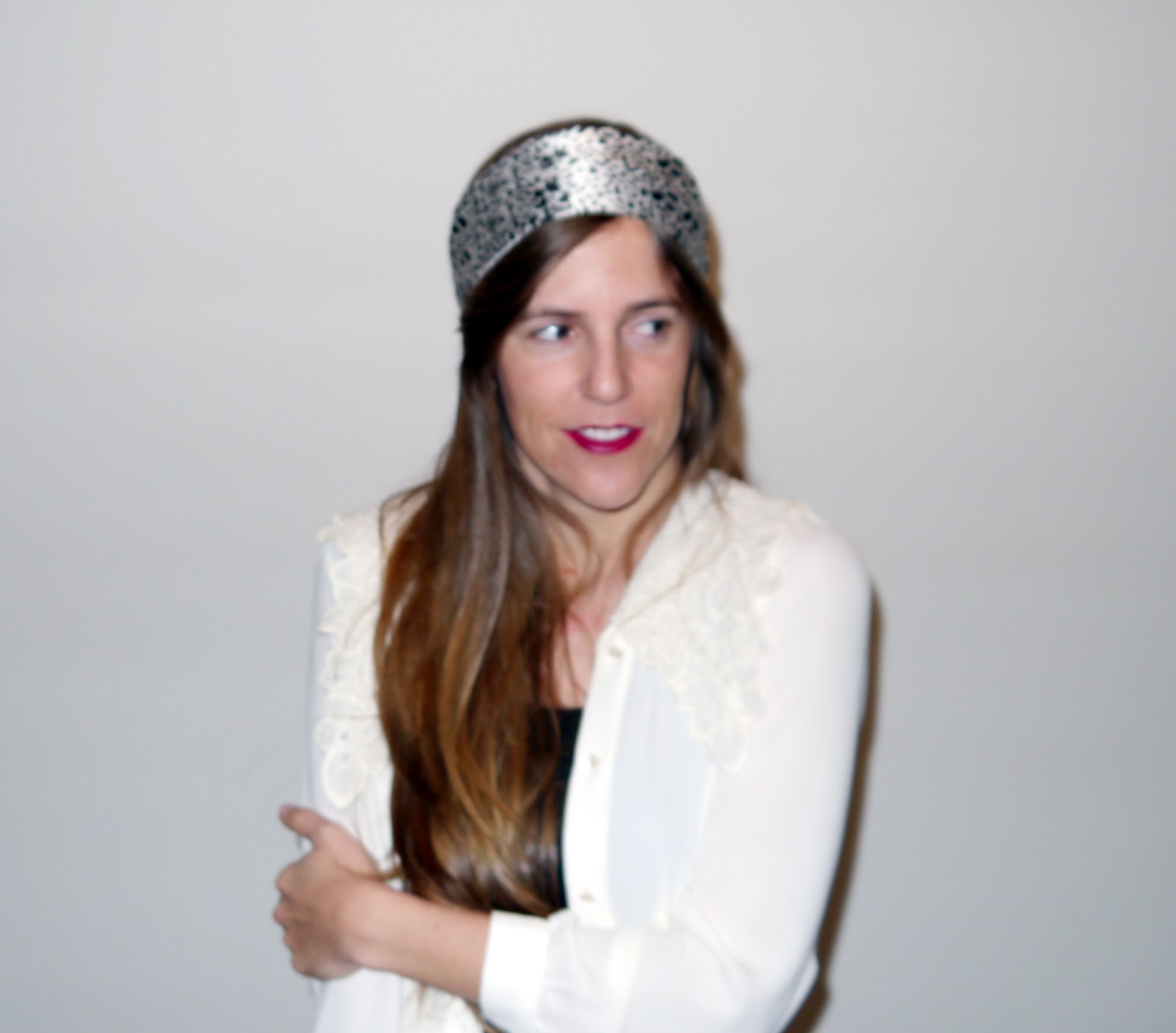 Esta vez decidí dejarme el pelo suelto y ponérmelo por encima ( al estilo icnta de pelo no me favorece) asi que así es como decidí llevar el pañuelo, ocn una camisa con cuello estilo antigüo de Sister Jane y camiseta básica negra debajo.