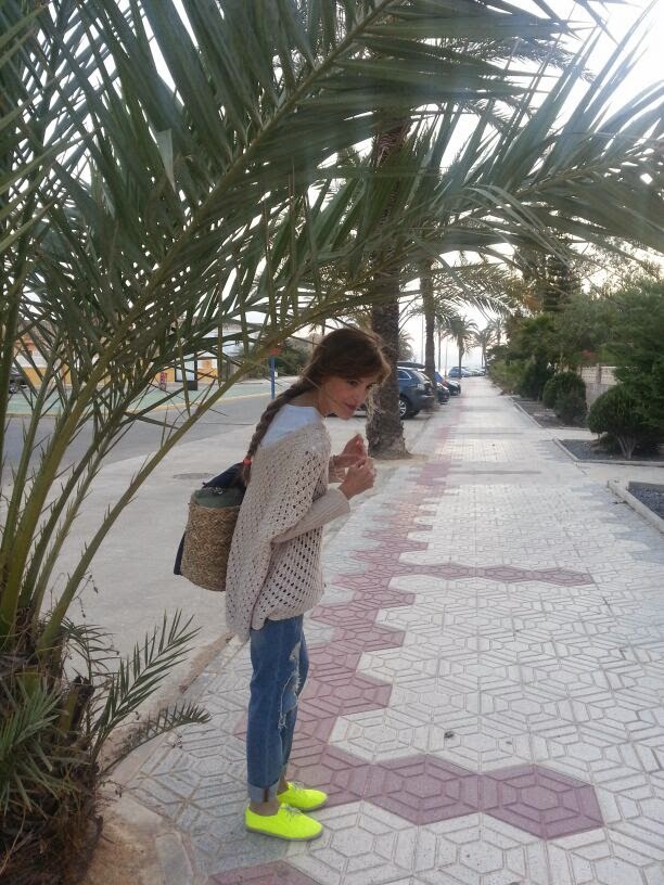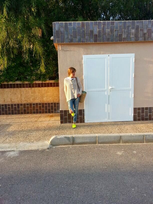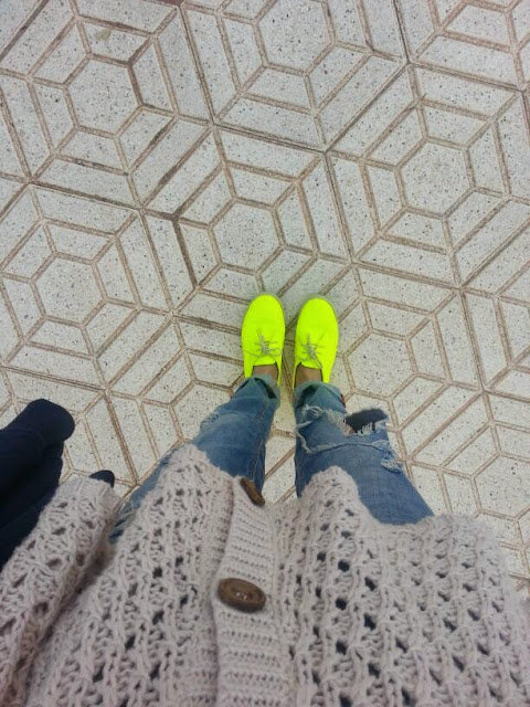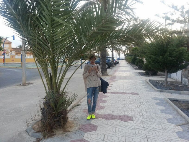 Asi que aquí os muestro el outfit para una tarde de paseo; chaqueta de Pull and Bear, vaqueros con rotos y zapatillas neon de HM.